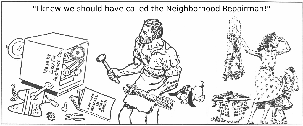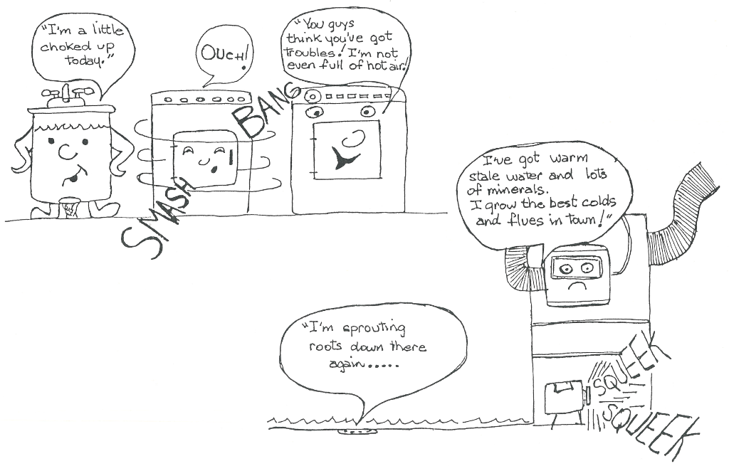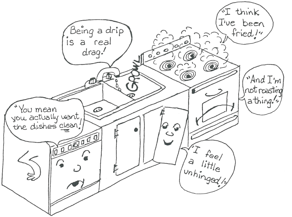 Fridges, freezers, stoves, dishwashers, washers, dryers, sinks, garburators, taps, toilets, clogged drains, furnace fans, humidifiers and plumbing.